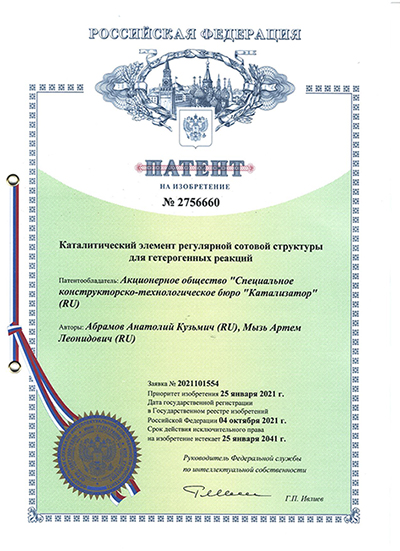SKTB Katalizator JSC has taken a new step towards environmental improvement by obtaining a Russian patent for a new invention «A catalytic element of a regular cellular structure for heterogeneous reactions".