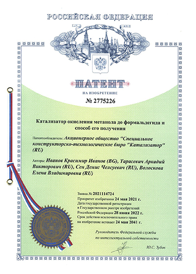 By the year 2022, SKTB Katalizator JSC launched a semi-commercial production of an iron-molybdenum catalyst, and also obtained a patent for invention No. 2775226 "Catalyst for the oxidation of methanol to formaldehyde and a method for its production" (Priority date 24.05.2021). Following the favourable decision to grant a Russian patent, the international application PCT/RU 2022/000150 was submitted.