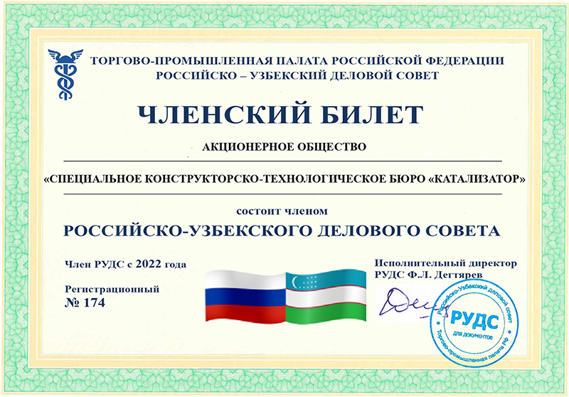 В сентябре 2022 года АО «СКТБ «Катализатор» вошло в состав действительных членов Российско-Узбекского делового совета (РУДС). Совет создан под эгидой Торгово-промышленной палаты РФ и объединяет российские и узбекские организации для выработки скоординированной позиции делового сообщества России в отношении взаимодействия с узбекскими партнерами и работы на рынках Узбекистана. Список членов РУДС насчитывает более 170 предприятий.